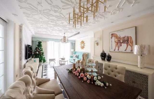 餐厅使用了沙发座,本案例空间非常宽敞,吊灯以重复的方式来对应狭长的餐桌,墙上的装饰画实际上沿用了空间的色彩舒心,所以它在那里让你感觉如此悦目。
