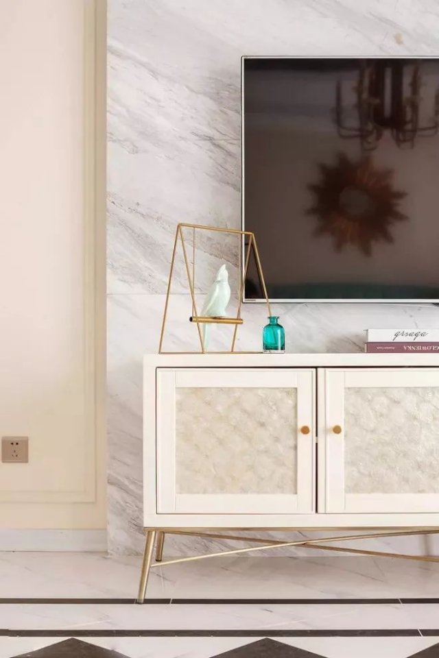 餐边柜非常非常的优雅,它的门板采用了藤编工艺,金色的柜脚轻灵华丽,这就是混搭的妙处。